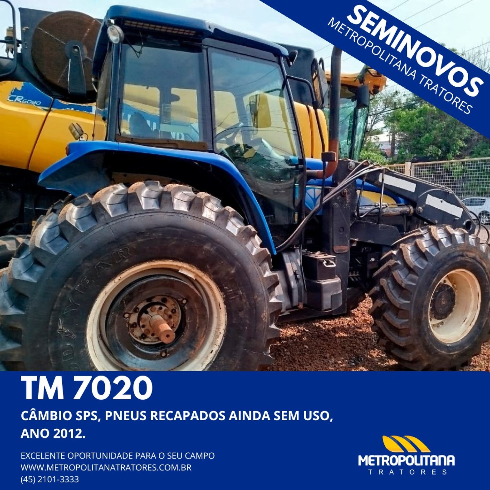 New Holland TM 7020 SPS cabinado ano 2012 com carregador frontal, acompanha lâmina, concha e gancho big bag 4 braços.